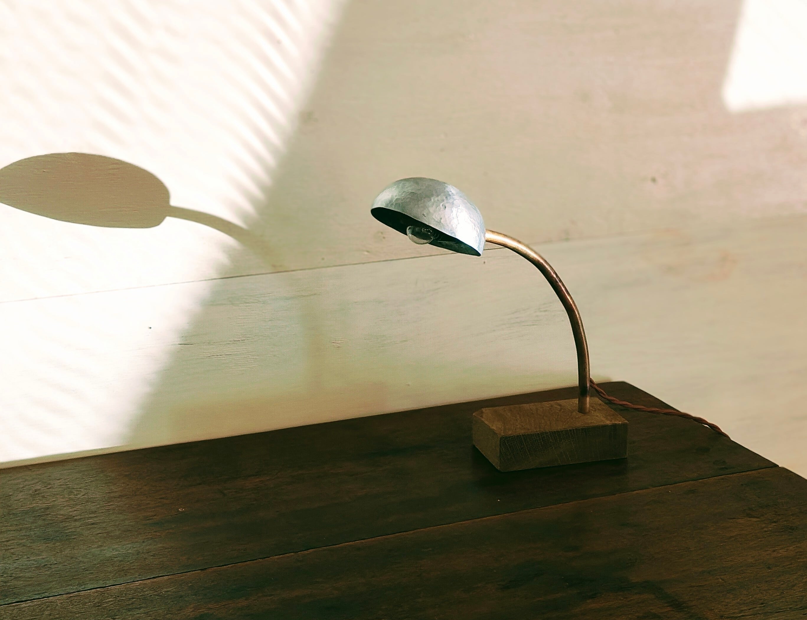 土台に楢材を使用し、真鍮パイプとアルミ板から叩き出したシェードのデスクランプ。 ソケット口金がE12に付き豆電球が使えて、ほのかな光が楽しめます。 本体 楢材、真鍮、アルミ 高さ 約28センチ 横幅 約24センチ ソケット E12 1A-125v コード アンティークブラウン 長さ約210センチ 電球はサービスでお付けしますが、ホームセンター等でお買い求めください。 E12豆電球10ワット以下推奨です。 ※作品について 手作り品の為、ひとつひとつサイズ、雰囲気が微妙に違い,製作上のキズ等もございます。未使用品であっても、大きさ、デザインもしくは色のイメージ違いによる返品・交換はご遠慮ください。 ご利用のブラウザ、モニターの性能、設定により商品の色、素材感等につきましては、 現物と若干の違いが出る場合がございます。あらかじめご了承くださいませ。