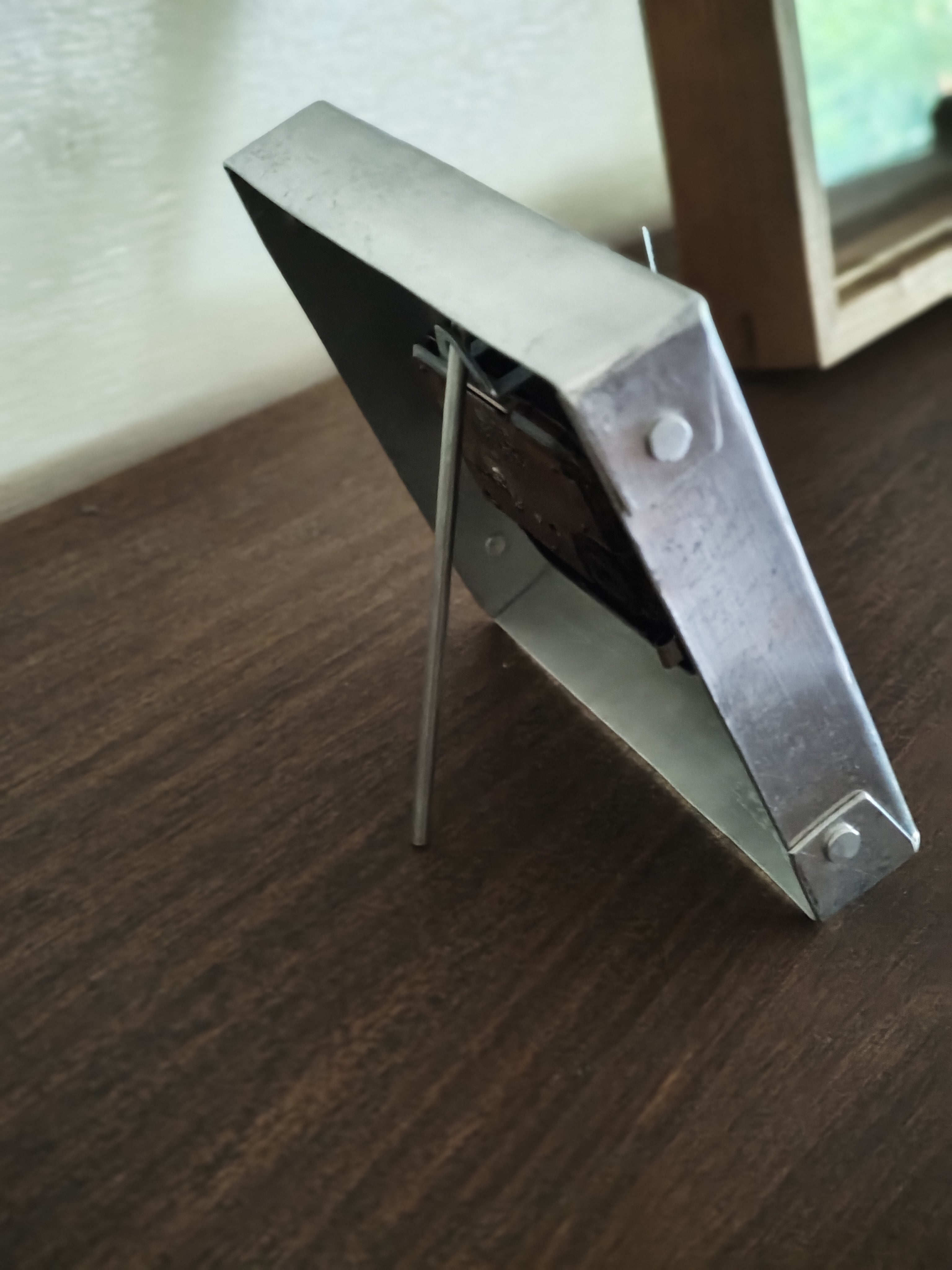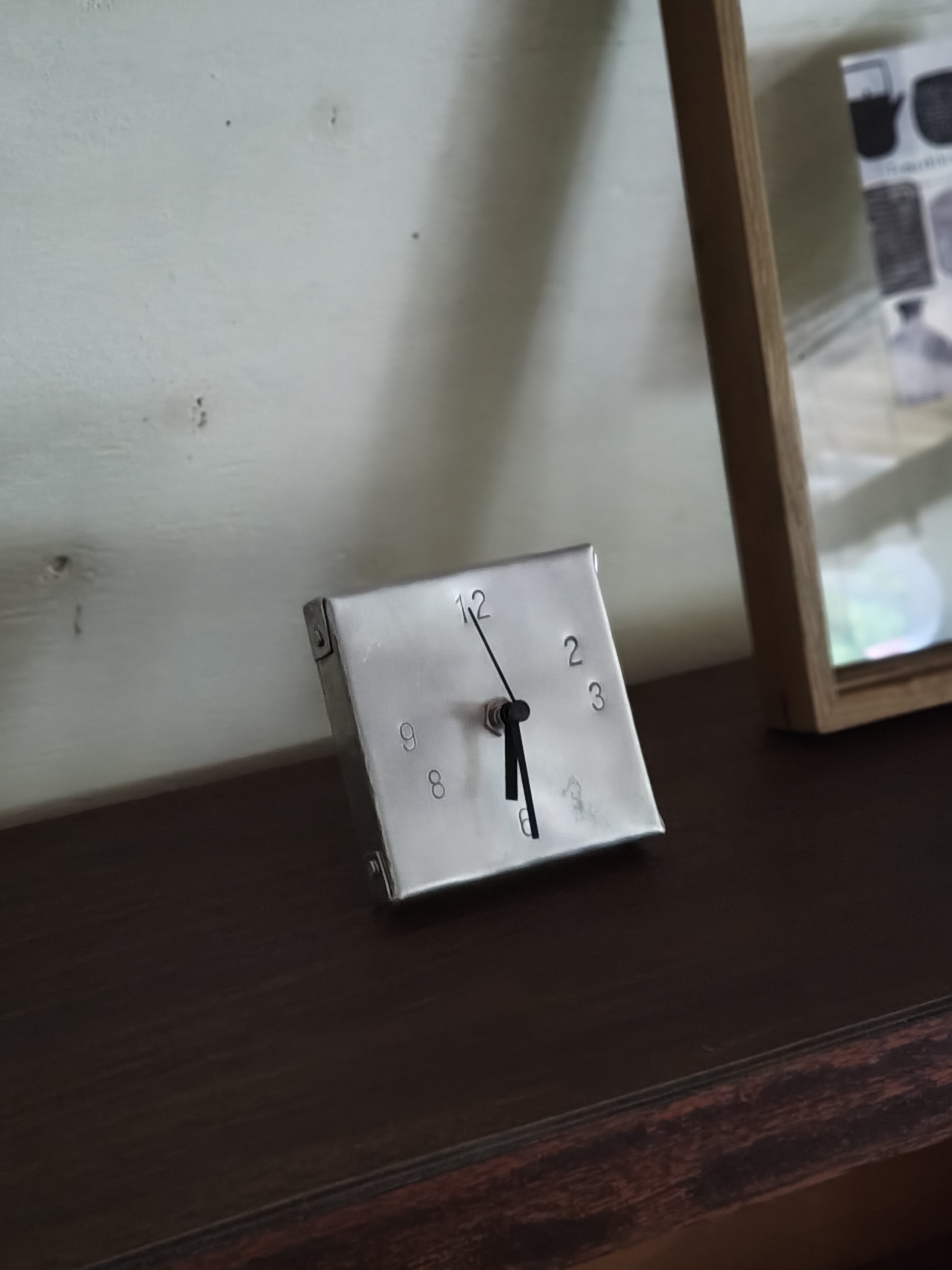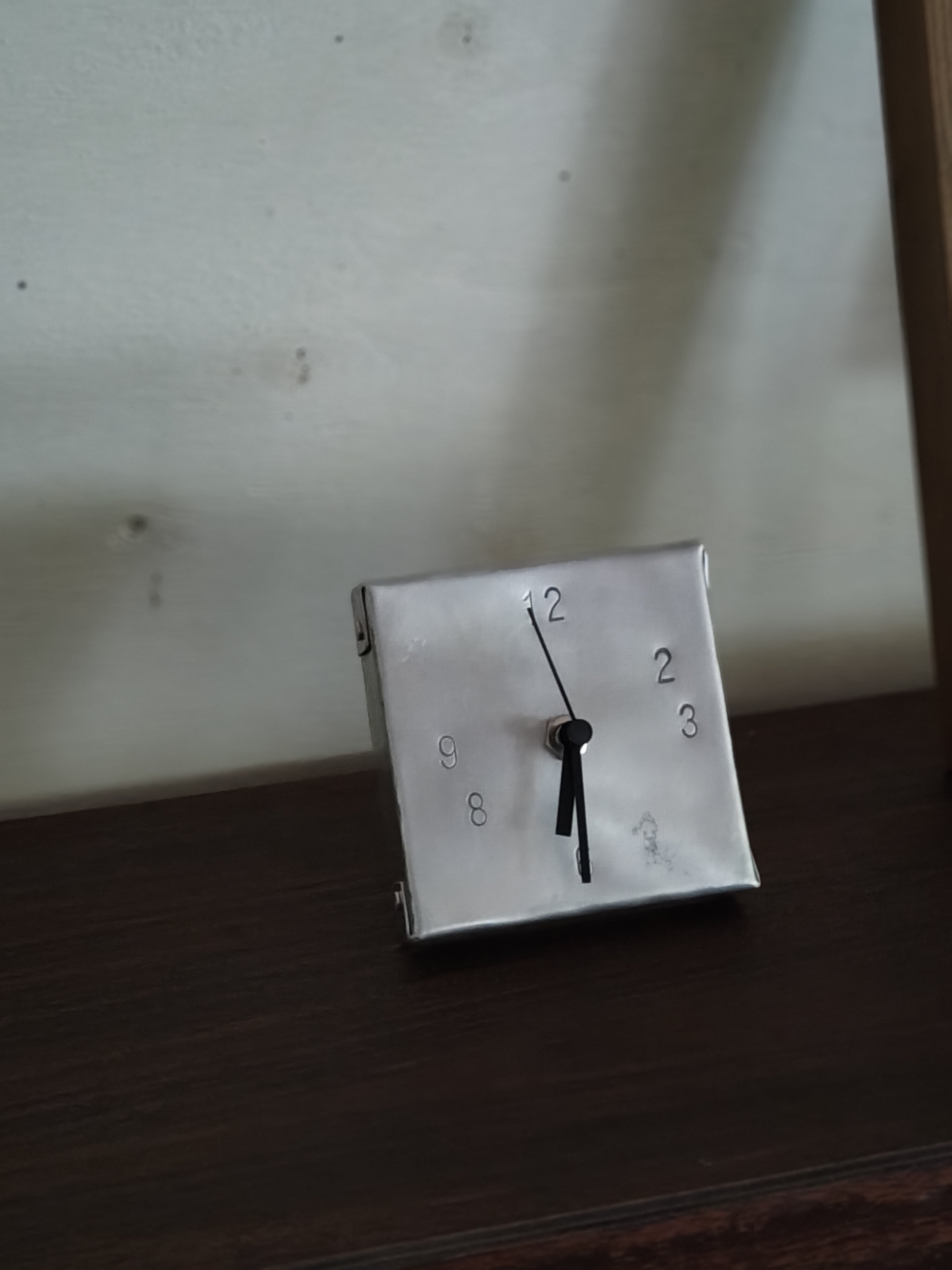 アルミの板材を曲げ加工し、ミニマルな四角形に仕立てた壁掛け時計。