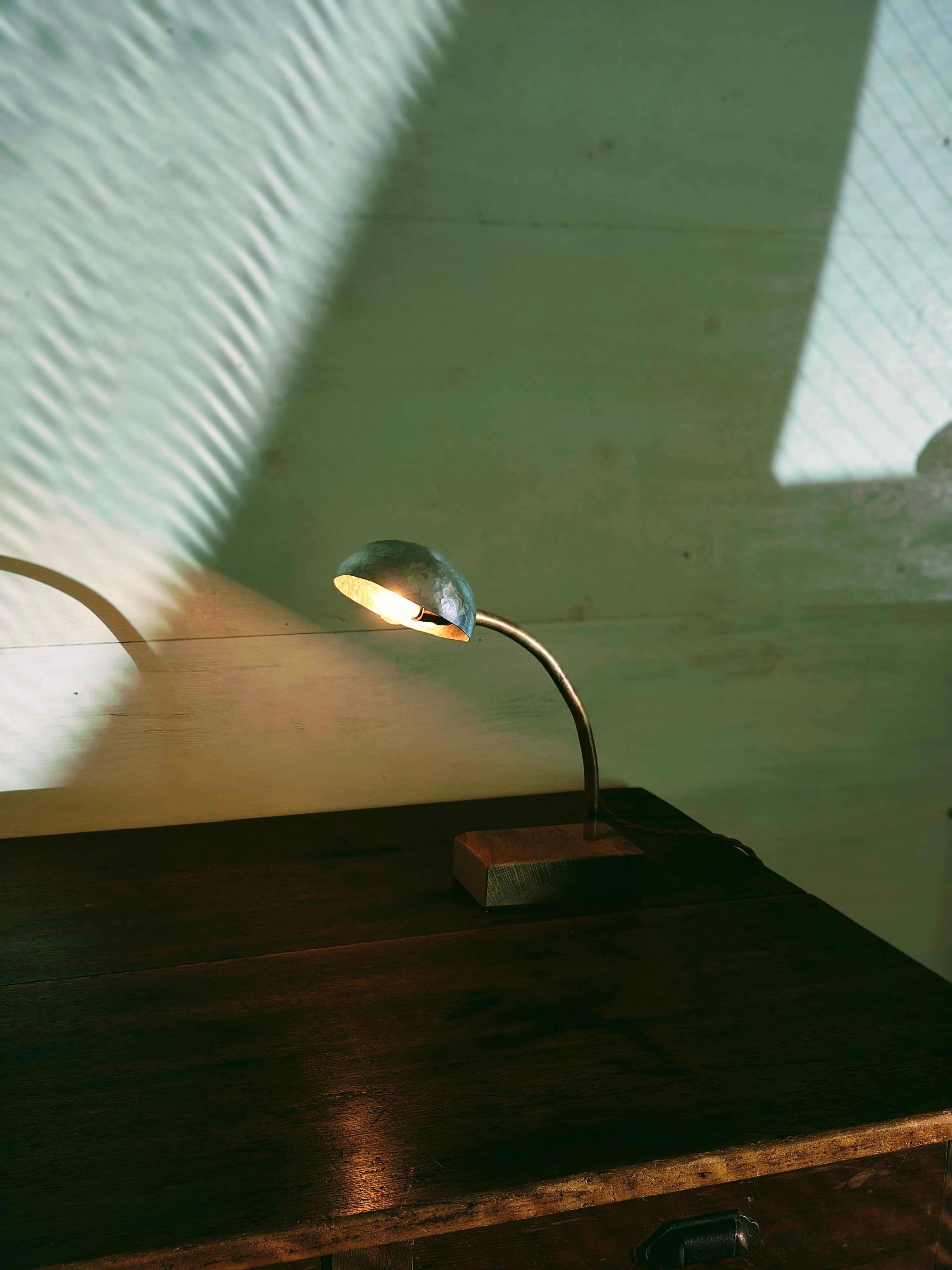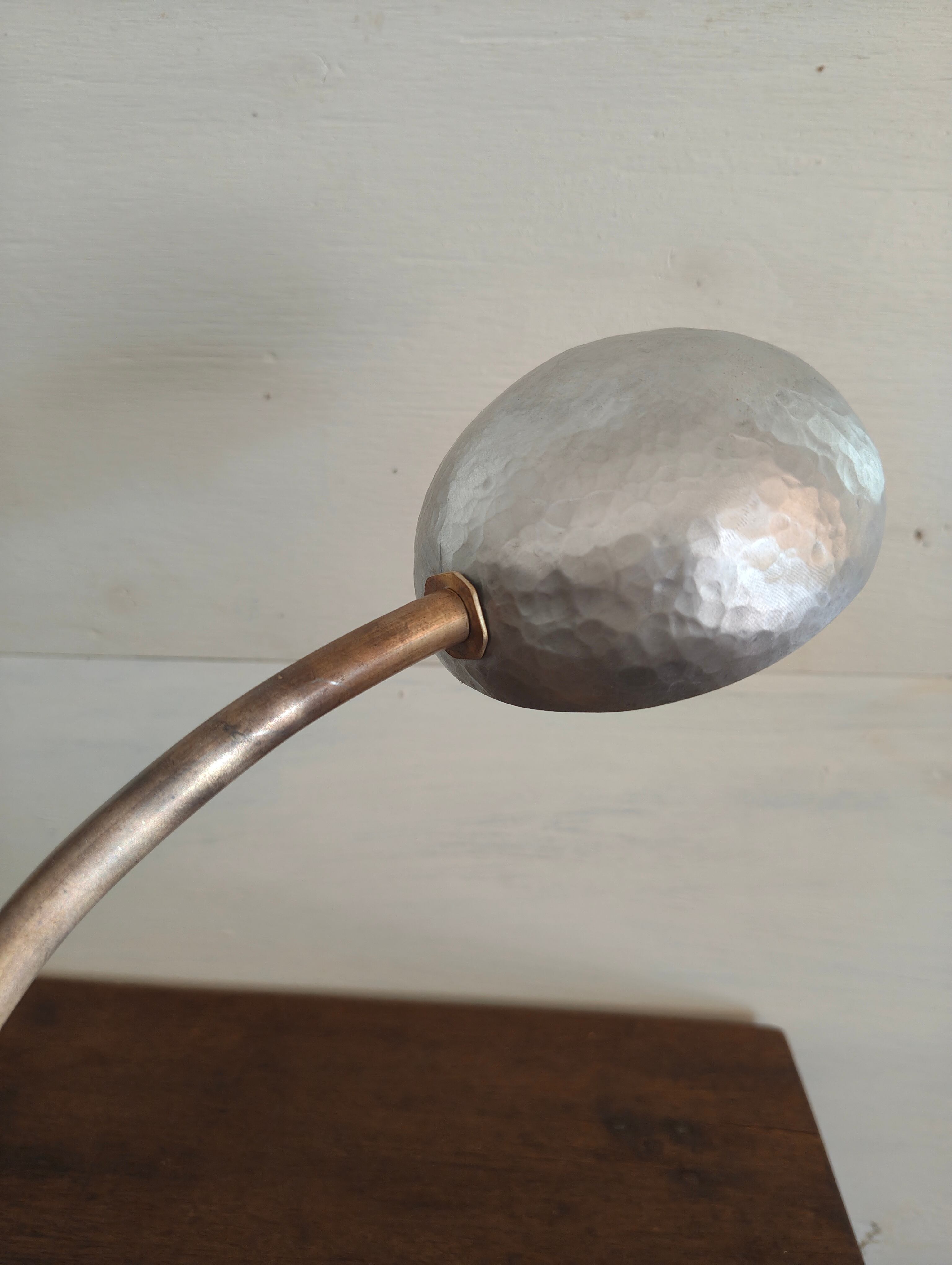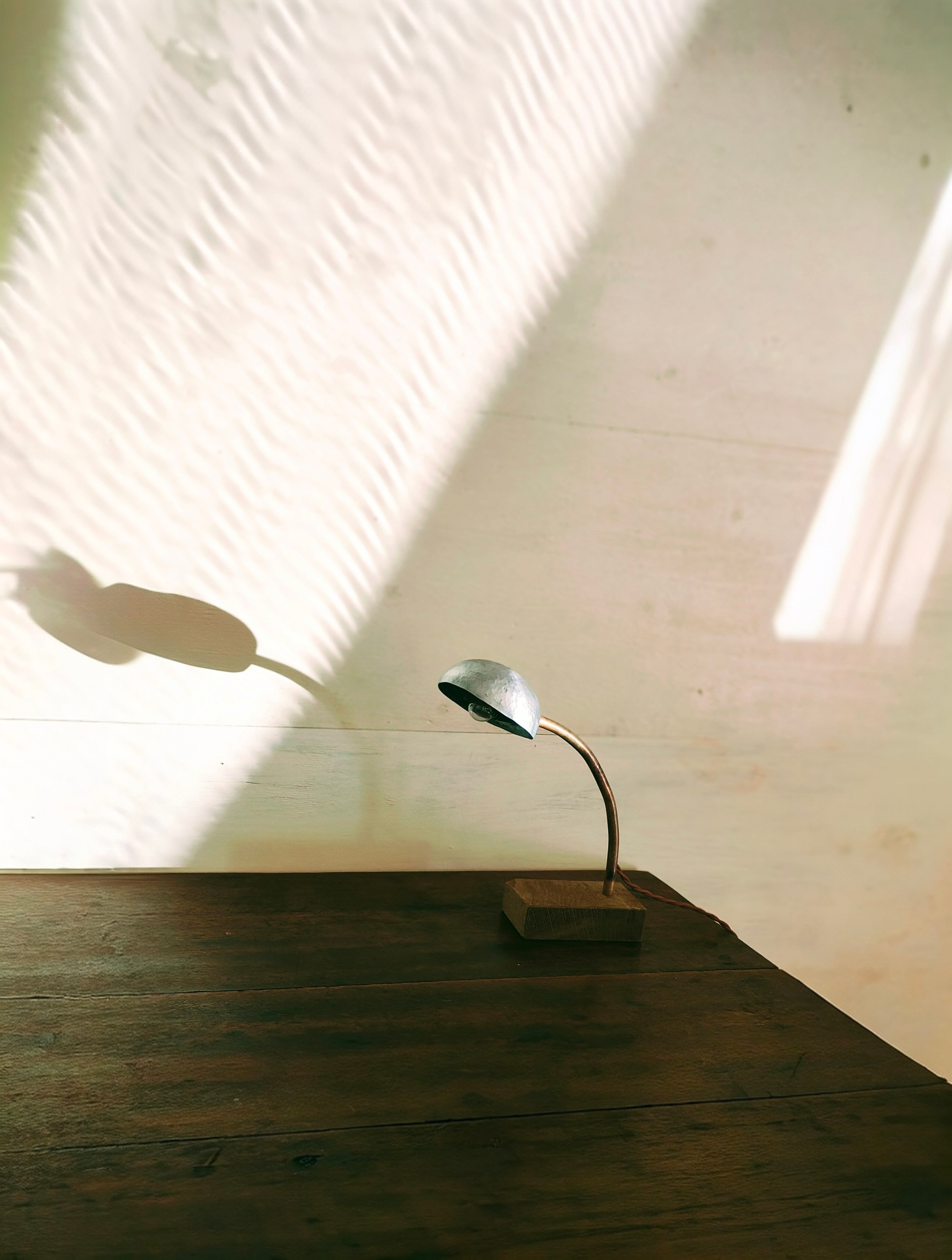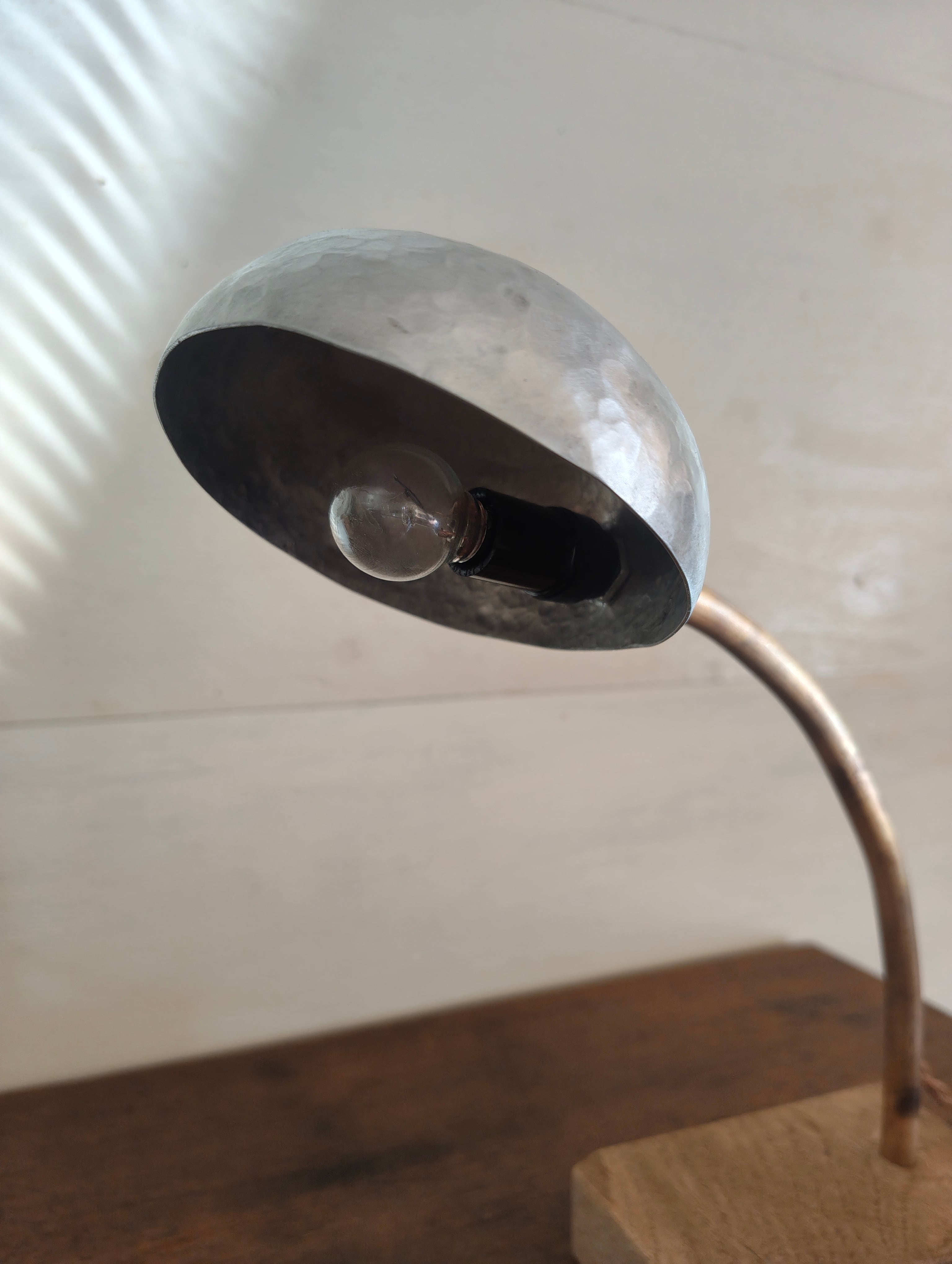 土台に楢材を使用し、真鍮パイプとアルミ板から叩き出したシェードのデスクランプ。